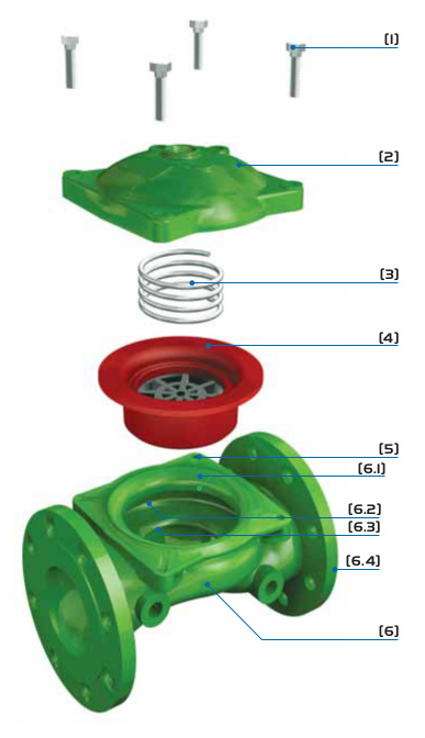 Le couvercle de la vanne sert à garder la membrane en place, et tenir et guider le ressort. Un seul resort est nécessaire pour la vanne, permettant une fermeture sûre et une ouverture à basse pression. La membrane souple comprends un corps central rigide permettant une fermeture complète. Le corps de la vanne est dessiné de façon à limiter les pertes de charges et résister à la cavitation. Elles sont disponibles généralement dans les diamètres les plus courants, du DN40 (1"½) à DN100 (4") et souvent même au dela jusqu'à DN400 et plus encore.