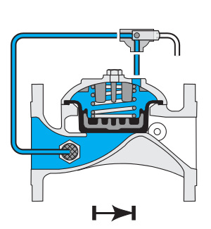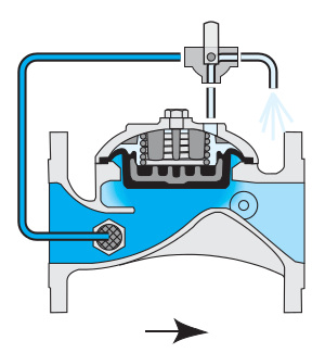On utilise la force de l'eau disponible en amont, pour obturer la vanne. En introduisant de l'eau dans la chambre de contrôle, la pression de l'eau additionnée de celle du ressort est suffisante pour pousser la membrane sur le siège et fermer la vanne.